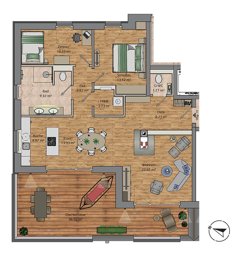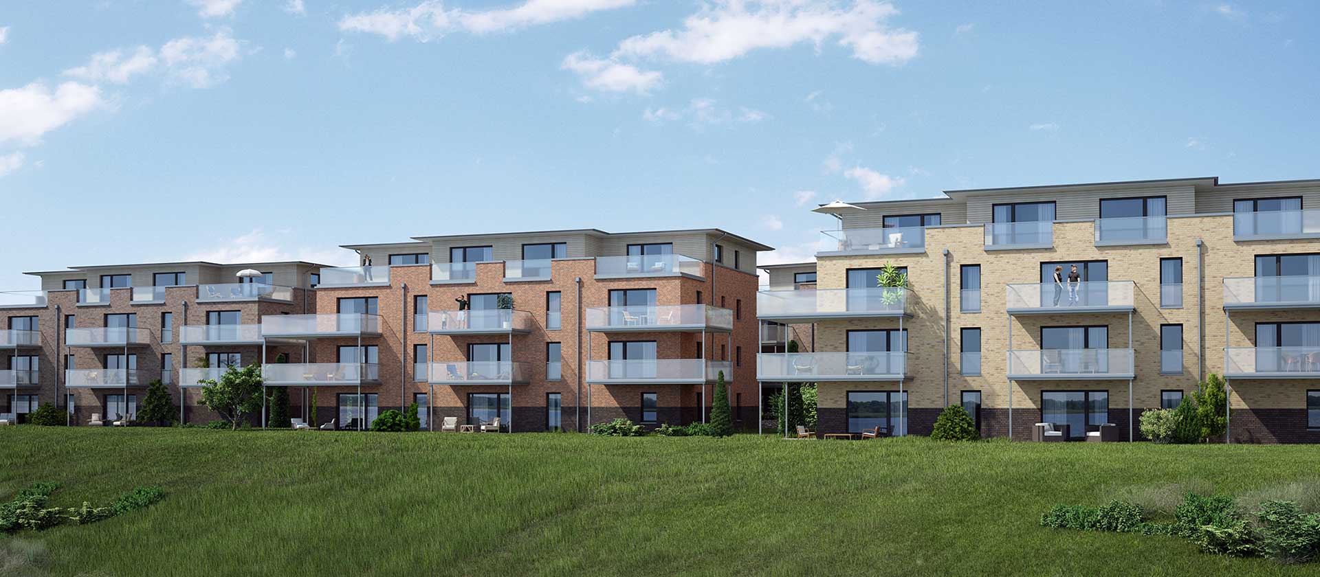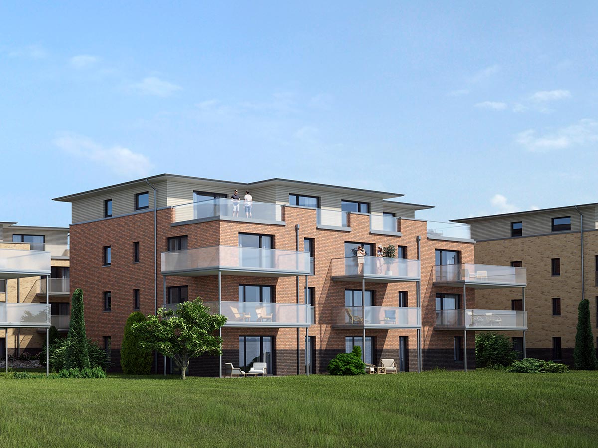 Auf fünf ansprechenden Mehrfamilienhäusern sind 49 stilvolle Wohnungen verteilt, bei denen es sich um 2- bis 4-Zimmer-Wohnungen mit großzügigen Wohnflächen von 60 bis 130 m² handelt. Jede Wohnung verfügt zudem über eine Terrasse, Balkon oder Dachterrasse. Jede Wohnung ist mithilfe eines Fahrstuhls erreichbar und ermöglicht einen bequemen Zugang zu allen Etagen. So sind die Wohnung ideal für Singles, Paare oder Familien und geeignet für alle Generationen. Für Ihr Fahrzeug steht eine Tiefgarage mit Kfz- und Fahrradstellplätzen zur Verfügung und auf Wunsch ist auch eine E-Lademöglichkeit an jeden Stellplatz umsetzbar. Die Versorgung erfolgt über Fernwärme aus erneuerbarer Energie und sorgt mit einer Fußbodenheizung für ein angenehmes Raumklima.